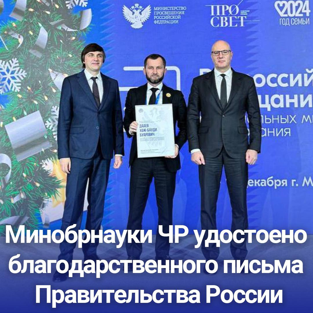 16.12.2024Министерство образования и науки Чеченской Республики удостоено благодарственного письма Правительства РФ за эффективную реализацию государственной политики в сфере образования.Благодарность передал вице-премьер Дмитрий Чернышенко министру образования и науки ЧР Хож-Бауди Дааеву на Всероссийском совещании руководителей органов управления в сфере образования.